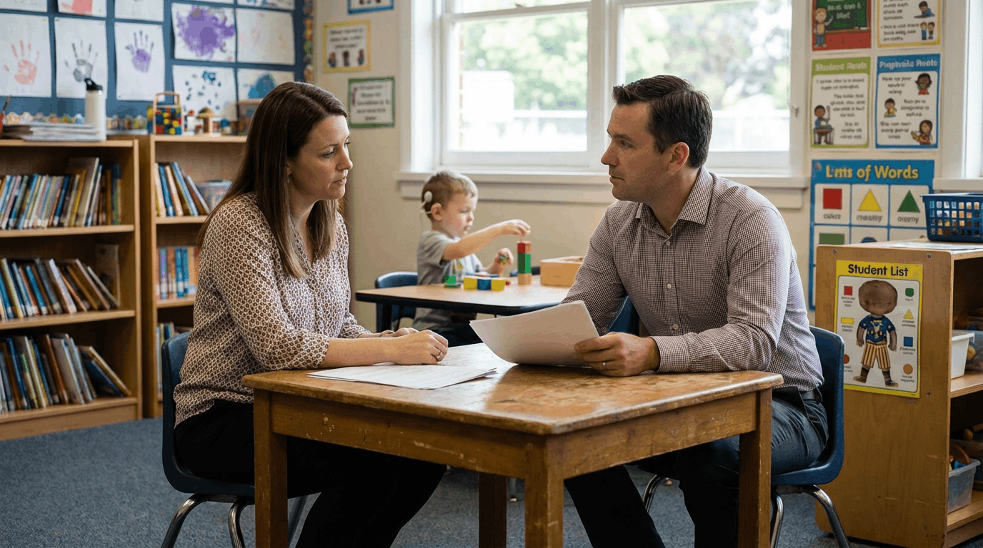 ילדים עם ירידה בשמיעה חווים לעיתים גם עומס רגשי. המאמץ המתמיד “להדביק את הקצב” עלול לפגוע בביטחון העצמי שלהם. חשוב לזהות סימני עייפות שמיעתית ולא לפרש אותם בטעות כחוסר מוטיבציה. תמיכה רגשית, שיח פתוח ומתן לגיטימציה לקושי מחזקים את תחושת המסוגלות והשייכות אצל התלמיד עם ליקוי השמיעה. הורה ומורה מנהלים שיחה רגועה בתוך כיתת לימוד על התקדמותו הלימודית של ילד, ילד עם שתל שבלול נראה ברקע, סגנון תיעודי ריאליסטי